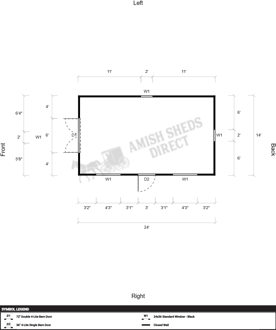 | Doors | 72" Double 4-Lite Barn Door, 36" 4-Lite Single Barn Door, Hinges Right |