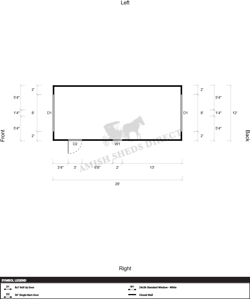 | Doors | 8×7 Roll Up Door x2, 36" Single Barn Door, Hinges Right |