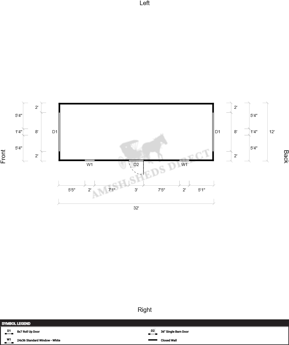 | Doors | 8×7 Roll Up Door x2, 36" Single Barn Door, Hinges Left |