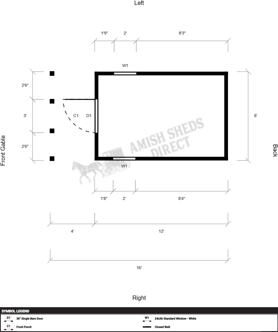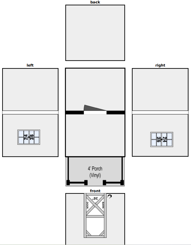 | Additional | Barn Door Color Matches Siding (Standard), Interior 36" Door ( Non-Visual ), Interior Shed Wall – Full Width (Finished with OSB on one side only) |