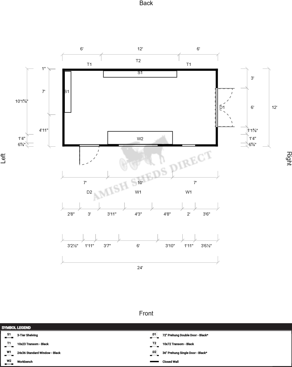 | Doors | 72" Prehung Double Door – Black*, 36" Prehung Single Door – Black*, Hinges Right |