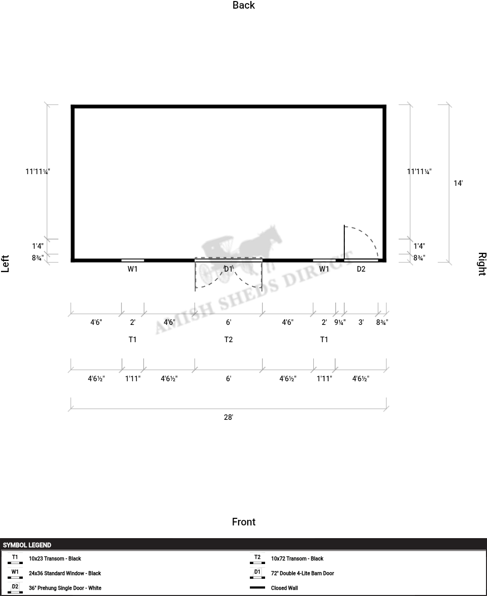 | Windows | 24×36 Standard Window – Black, Color: Black x2, 10×72 Transom – Black, 10×23 Transom – Black x2 |